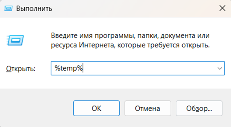 Повторите то же самое: нажмите Win + R, введите temp (без знака процента) - это вторая системная папка с временными файлами.